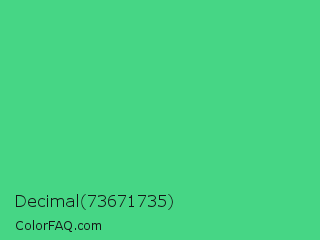 Decimal 73671735 Color is a normal green color and the nearest color is Emerald #50c878. Hex code #46d685 and RGB value is rgb(70,214,133). In RGB color space, this color is composed of 27% red, 84% green, 52% blue, In CMYK color space, this color is composed of 67% cyan, 0% magenta, 38% yellow , 16% black , In HSL color space, this color has a hue angle of 146° , 64% saturation and 56% lightness.