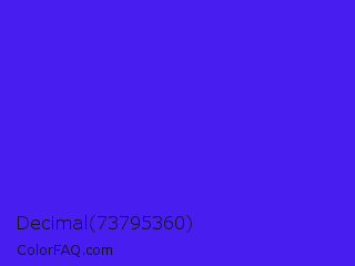 Decimal 73795360 Color is a normal indigo color and the nearest color is Han Purple #5218fa. Hex code #471df0 and RGB value is rgb(71,29,240). In RGB color space, this color is composed of 28% red, 11% green, 94% blue, In CMYK color space, this color is composed of 70% cyan, 88% magenta, 0% yellow , 6% black , In HSL color space, this color has a hue angle of 252° , 88% saturation and 53% lightness.
