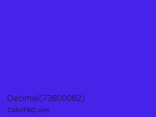 Decimal 73800082 Color is a normal indigo color and the nearest color is Han Purple #5218fa. Hex code #4722e8 and RGB value is rgb(71,34,232). In RGB color space, this color is composed of 28% red, 13% green, 91% blue, In CMYK color space, this color is composed of 69% cyan, 85% magenta, 0% yellow , 9% black , In HSL color space, this color has a hue angle of 251° , 81% saturation and 52% lightness.