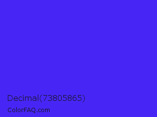Decimal 73805865 Color is a normal indigo color and the nearest color is Han Purple #5218fa. Hex code #4726f5 and RGB value is rgb(71,38,245). In RGB color space, this color is composed of 28% red, 15% green, 96% blue, In CMYK color space, this color is composed of 71% cyan, 84% magenta, 0% yellow , 4% black , In HSL color space, this color has a hue angle of 250° , 91% saturation and 55% lightness.