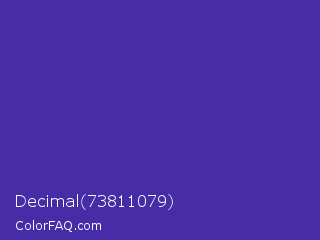 Decimal 73811079 Color is a normal indigo color and the nearest color is Daisy Bush #4f2398. Hex code #472ca7 and RGB value is rgb(71,44,167). In RGB color space, this color is composed of 28% red, 17% green, 65% blue, In CMYK color space, this color is composed of 57% cyan, 74% magenta, 0% yellow , 35% black , In HSL color space, this color has a hue angle of 253° , 58% saturation and 41% lightness.