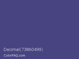 Decimal 73860499 Color is a normal indigo color and the nearest color is East Bay #414c7d. Hex code #474481 and RGB value is rgb(71,68,129). In RGB color space, this color is composed of 28% red, 27% green, 51% blue, In CMYK color space, this color is composed of 45% cyan, 47% magenta, 0% yellow , 49% black , In HSL color space, this color has a hue angle of 243° , 31% saturation and 39% lightness.