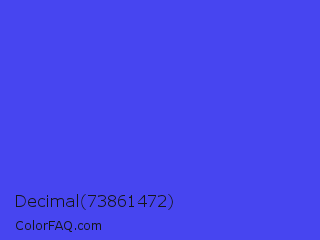 Decimal 73861472 Color is a light indigo color and the nearest color is Majorelle Blue #6050dc. Hex code #4745f0 and RGB value is rgb(71,69,240). In RGB color space, this color is composed of 28% red, 27% green, 94% blue, In CMYK color space, this color is composed of 70% cyan, 71% magenta, 0% yellow , 6% black , In HSL color space, this color has a hue angle of 241° , 85% saturation and 61% lightness.