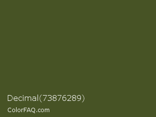 Decimal 73876289 Color is a dark lime color and the nearest color is Army Green #4b5320. Hex code #475325 and RGB value is rgb(71,83,37). In RGB color space, this color is composed of 28% red, 33% green, 15% blue, In CMYK color space, this color is composed of 14% cyan, 0% magenta, 55% yellow , 67% black , In HSL color space, this color has a hue angle of 76° , 38% saturation and 24% lightness.