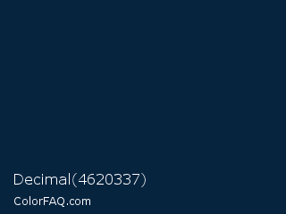 Decimal 4620337 Color is a very dark blue color and the nearest color is Maastricht Blue #001c3d. Hex code #07243f and RGB value is rgb(7,36,63). In RGB color space, this color is composed of 3% red, 14% green, 25% blue, In CMYK color space, this color is composed of 89% cyan, 43% magenta, 0% yellow , 75% black , In HSL color space, this color has a hue angle of 209° , 80% saturation and 14% lightness.
