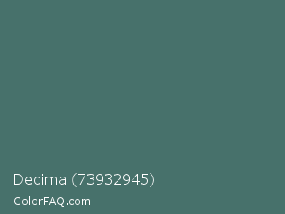 Decimal 73932945 Color is a normal cyan color and the nearest color is Hookers Green #49796b. Hex code #47716b and RGB value is rgb(71,113,107). In RGB color space, this color is composed of 28% red, 44% green, 42% blue, In CMYK color space, this color is composed of 37% cyan, 0% magenta, 5% yellow , 56% black , In HSL color space, this color has a hue angle of 171° , 23% saturation and 36% lightness.