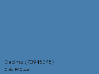 Decimal 73946245 Color is a normal blue color and the nearest color is Steel Blue #4682b4. Hex code #477ead and RGB value is rgb(71,126,173). In RGB color space, this color is composed of 28% red, 49% green, 68% blue, In CMYK color space, this color is composed of 59% cyan, 27% magenta, 0% yellow , 32% black , In HSL color space, this color has a hue angle of 208° , 42% saturation and 48% lightness.