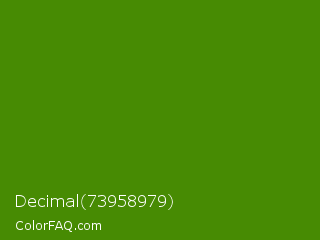 Decimal 73958979 Color is a dark green color and the nearest color is Avocado #568203. Hex code #478b03 and RGB value is rgb(71,139,3). In RGB color space, this color is composed of 28% red, 55% green, 1% blue, In CMYK color space, this color is composed of 49% cyan, 0% magenta, 98% yellow , 45% black , In HSL color space, this color has a hue angle of 90° , 96% saturation and 28% lightness.