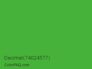 Decimal 74024577 Color is a normal green color and the nearest color is Apple #4fa83d. Hex code #47b239 and RGB value is rgb(71,178,57). In RGB color space, this color is composed of 28% red, 70% green, 22% blue, In CMYK color space, this color is composed of 60% cyan, 0% magenta, 68% yellow , 30% black , In HSL color space, this color has a hue angle of 113° , 51% saturation and 46% lightness.