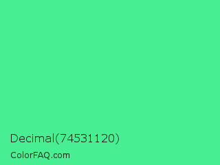 Decimal 74531120 Color is a light green color and the nearest color is Very Light Malachite Green #64e986. Hex code #47ee92 and RGB value is rgb(71,238,146). In RGB color space, this color is composed of 28% red, 93% green, 57% blue, In CMYK color space, this color is composed of 70% cyan, 0% magenta, 39% yellow , 7% black , In HSL color space, this color has a hue angle of 147° , 83% saturation and 61% lightness.