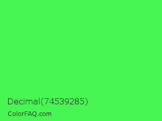 Decimal 74539285 Color is a light green color and the nearest color is Screamin Green #66ff66. Hex code #47f653 and RGB value is rgb(71,246,83). In RGB color space, this color is composed of 28% red, 96% green, 33% blue, In CMYK color space, this color is composed of 71% cyan, 0% magenta, 66% yellow , 4% black , In HSL color space, this color has a hue angle of 124° , 91% saturation and 62% lightness.