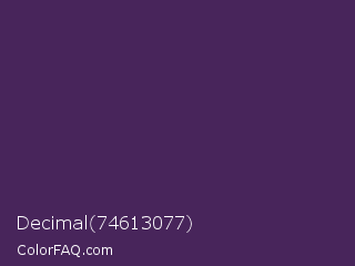 Decimal 74613077 Color is a dark purple color and the nearest color is Bossanova #4e2a5a. Hex code #48255b and RGB value is rgb(72,37,91). In RGB color space, this color is composed of 28% red, 15% green, 36% blue, In CMYK color space, this color is composed of 21% cyan, 59% magenta, 0% yellow , 64% black , In HSL color space, this color has a hue angle of 279° , 42% saturation and 25% lightness.