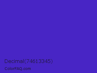 Decimal 74613345 Color is a normal indigo color and the nearest color is Purple Heart Crayola #652dc1. Hex code #4825c5 and RGB value is rgb(72,37,197). In RGB color space, this color is composed of 28% red, 15% green, 77% blue, In CMYK color space, this color is composed of 63% cyan, 81% magenta, 0% yellow , 23% black , In HSL color space, this color has a hue angle of 253° , 68% saturation and 46% lightness.