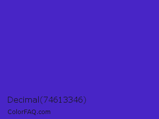 Decimal 74613346 Color is a normal indigo color and the nearest color is Purple Heart Crayola #652dc1. Hex code #4825c6 and RGB value is rgb(72,37,198). In RGB color space, this color is composed of 28% red, 15% green, 78% blue, In CMYK color space, this color is composed of 64% cyan, 81% magenta, 0% yellow , 22% black , In HSL color space, this color has a hue angle of 253° , 69% saturation and 46% lightness.