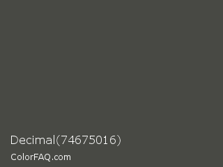 Decimal 74675016 Color is a dark lime color and the nearest color is Tundora #4a4244. Hex code #484944 and RGB value is rgb(72,73,68). In RGB color space, this color is composed of 28% red, 29% green, 27% blue, In CMYK color space, this color is composed of 1% cyan, 0% magenta, 7% yellow , 71% black , In HSL color space, this color has a hue angle of 72° , 4% saturation and 28% lightness.