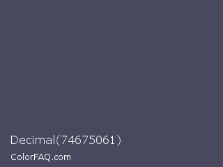 Decimal 74675061 Color is a normal blue color and the nearest color is Trout #4a4e5a. Hex code #48495f and RGB value is rgb(72,73,95). In RGB color space, this color is composed of 28% red, 29% green, 37% blue, In CMYK color space, this color is composed of 24% cyan, 23% magenta, 0% yellow , 63% black , In HSL color space, this color has a hue angle of 237° , 14% saturation and 33% lightness.