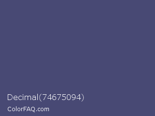 Decimal 74675094 Color is a normal blue color and the nearest color is Independence #4c516d. Hex code #484974 and RGB value is rgb(72,73,116). In RGB color space, this color is composed of 28% red, 29% green, 45% blue, In CMYK color space, this color is composed of 38% cyan, 37% magenta, 0% yellow , 55% black , In HSL color space, this color has a hue angle of 239° , 23% saturation and 37% lightness.