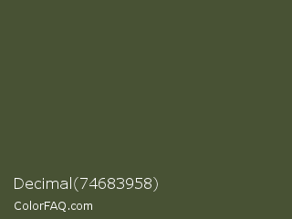 Decimal 74683958 Color is a dark green color and the nearest color is Rifle Green #444c38. Hex code #485234 and RGB value is rgb(72,82,52). In RGB color space, this color is composed of 28% red, 32% green, 20% blue, In CMYK color space, this color is composed of 12% cyan, 0% magenta, 37% yellow , 68% black , In HSL color space, this color has a hue angle of 80° , 22% saturation and 26% lightness.