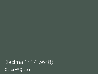 Decimal 74715648 Color is a normal green color and the nearest color is Nandor #4b5d52. Hex code #485850 and RGB value is rgb(72,88,80). In RGB color space, this color is composed of 28% red, 35% green, 31% blue, In CMYK color space, this color is composed of 18% cyan, 0% magenta, 9% yellow , 65% black , In HSL color space, this color has a hue angle of 150° , 10% saturation and 31% lightness.