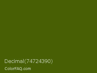Decimal 74724390 Color is a very dark lime color and the nearest color is Verdun Green #495400. Hex code #486102 and RGB value is rgb(72,97,2). In RGB color space, this color is composed of 28% red, 38% green, 1% blue, In CMYK color space, this color is composed of 26% cyan, 0% magenta, 98% yellow , 62% black , In HSL color space, this color has a hue angle of 76° , 96% saturation and 19% lightness.