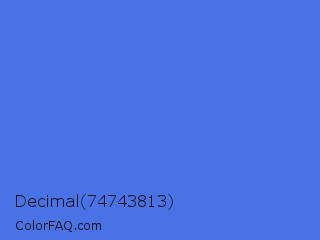Decimal 74743813 Color is a normal blue color and the nearest color is Royal Blue #4169e1. Hex code #4872e5 and RGB value is rgb(72,114,229). In RGB color space, this color is composed of 28% red, 45% green, 90% blue, In CMYK color space, this color is composed of 69% cyan, 50% magenta, 0% yellow , 10% black , In HSL color space, this color has a hue angle of 224° , 75% saturation and 59% lightness.