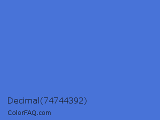 Decimal 74744392 Color is a normal blue color and the nearest color is Han Blue #446ccf. Hex code #4873d8 and RGB value is rgb(72,115,216). In RGB color space, this color is composed of 28% red, 45% green, 85% blue, In CMYK color space, this color is composed of 67% cyan, 47% magenta, 0% yellow , 15% black , In HSL color space, this color has a hue angle of 222° , 65% saturation and 56% lightness.