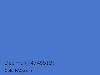 Decimal 74748513 Color is a normal blue color and the nearest color is Han Blue #446ccf. Hex code #4877cd and RGB value is rgb(72,119,205). In RGB color space, this color is composed of 28% red, 47% green, 80% blue, In CMYK color space, this color is composed of 65% cyan, 42% magenta, 0% yellow , 20% black , In HSL color space, this color has a hue angle of 219° , 57% saturation and 54% lightness.