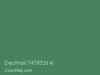 Decimal 74785314 Color is a normal green color and the nearest color is Middle Green #4d8c57. Hex code #48835e and RGB value is rgb(72,131,94). In RGB color space, this color is composed of 28% red, 51% green, 37% blue, In CMYK color space, this color is composed of 45% cyan, 0% magenta, 28% yellow , 49% black , In HSL color space, this color has a hue angle of 142° , 29% saturation and 40% lightness.