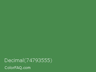 Decimal 74793555 Color is a normal green color and the nearest color is Middle Green #4d8c57. Hex code #488b4d and RGB value is rgb(72,139,77). In RGB color space, this color is composed of 28% red, 55% green, 30% blue, In CMYK color space, this color is composed of 48% cyan, 0% magenta, 45% yellow , 45% black , In HSL color space, this color has a hue angle of 124° , 32% saturation and 41% lightness.