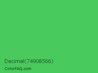 Decimal 74908566 Color is a normal green color and the nearest color is UFO Green #3cd070. Hex code #48ca5c and RGB value is rgb(72,202,92). In RGB color space, this color is composed of 28% red, 79% green, 36% blue, In CMYK color space, this color is composed of 64% cyan, 0% magenta, 54% yellow , 21% black , In HSL color space, this color has a hue angle of 129° , 55% saturation and 54% lightness.