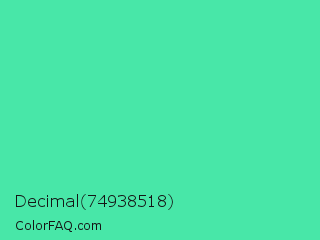 Decimal 74938518 Color is a normal green color and the nearest color is Eucalyptus #44d7a8. Hex code #48e7a8 and RGB value is rgb(72,231,168). In RGB color space, this color is composed of 28% red, 91% green, 66% blue, In CMYK color space, this color is composed of 69% cyan, 0% magenta, 27% yellow , 9% black , In HSL color space, this color has a hue angle of 156° , 77% saturation and 59% lightness.