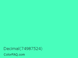 Decimal 74987524 Color is a light green color and the nearest color is Turquoise #40e0d0. Hex code #48febc and RGB value is rgb(72,254,188). In RGB color space, this color is composed of 28% red, 100% green, 74% blue, In CMYK color space, this color is composed of 72% cyan, 0% magenta, 26% yellow , 0% black , In HSL color space, this color has a hue angle of 158° , 99% saturation and 64% lightness.