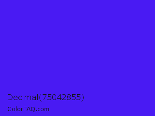 Decimal 75042855 Color is a normal indigo color and the nearest color is Han Purple #5218fa. Hex code #491af3 and RGB value is rgb(73,26,243). In RGB color space, this color is composed of 29% red, 10% green, 95% blue, In CMYK color space, this color is composed of 70% cyan, 89% magenta, 0% yellow , 5% black , In HSL color space, this color has a hue angle of 253° , 90% saturation and 53% lightness.