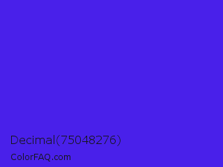 Decimal 75048276 Color is a normal indigo color and the nearest color is Han Purple #5218fa. Hex code #4920ea and RGB value is rgb(73,32,234). In RGB color space, this color is composed of 29% red, 13% green, 92% blue, In CMYK color space, this color is composed of 69% cyan, 86% magenta, 0% yellow , 8% black , In HSL color space, this color has a hue angle of 252° , 83% saturation and 52% lightness.
