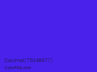 Decimal 75048977 Color is a normal indigo color and the nearest color is Han Purple #5218fa. Hex code #4921eb and RGB value is rgb(73,33,235). In RGB color space, this color is composed of 29% red, 13% green, 92% blue, In CMYK color space, this color is composed of 69% cyan, 86% magenta, 0% yellow , 8% black , In HSL color space, this color has a hue angle of 252° , 83% saturation and 53% lightness.