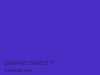 Decimal 75061317 Color is a normal indigo color and the nearest color is Ocean Blue #4f42b5. Hex code #492dc5 and RGB value is rgb(73,45,197). In RGB color space, this color is composed of 29% red, 18% green, 77% blue, In CMYK color space, this color is composed of 63% cyan, 77% magenta, 0% yellow , 23% black , In HSL color space, this color has a hue angle of 251° , 63% saturation and 47% lightness.