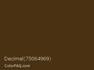 Decimal 75064969 Color is a very dark orange color and the nearest color is Metallic Bronze #49371b. Hex code #493111 and RGB value is rgb(73,49,17). In RGB color space, this color is composed of 29% red, 19% green, 7% blue, In CMYK color space, this color is composed of 0% cyan, 33% magenta, 77% yellow , 71% black , In HSL color space, this color has a hue angle of 34° , 62% saturation and 18% lightness.