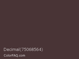 Decimal 75068564 Color is a dark red color and the nearest color is Woody Brown #483131. Hex code #493436 and RGB value is rgb(73,52,54). In RGB color space, this color is composed of 29% red, 20% green, 21% blue, In CMYK color space, this color is composed of 0% cyan, 29% magenta, 26% yellow , 71% black , In HSL color space, this color has a hue angle of 354° , 17% saturation and 25% lightness.