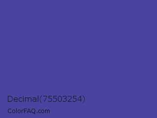 Decimal 75503254 Color is a normal indigo color and the nearest color is Gigas #523c94. Hex code #4944a0 and RGB value is rgb(73,68,160). In RGB color space, this color is composed of 29% red, 27% green, 63% blue, In CMYK color space, this color is composed of 54% cyan, 58% magenta, 0% yellow , 37% black , In HSL color space, this color has a hue angle of 243° , 40% saturation and 45% lightness.