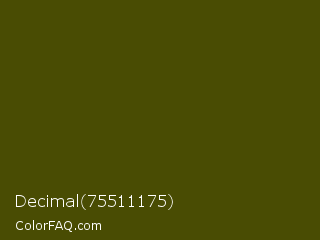 Decimal 75511175 Color is a very dark yellow color and the nearest color is Verdun Green #495400. Hex code #494c03 and RGB value is rgb(73,76,3). In RGB color space, this color is composed of 29% red, 30% green, 1% blue, In CMYK color space, this color is composed of 4% cyan, 0% magenta, 96% yellow , 70% black , In HSL color space, this color has a hue angle of 62° , 92% saturation and 15% lightness.
