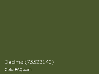 Decimal 75523140 Color is a dark green color and the nearest color is Woodland #4d5328. Hex code #49572c and RGB value is rgb(73,87,44). In RGB color space, this color is composed of 29% red, 34% green, 17% blue, In CMYK color space, this color is composed of 16% cyan, 0% magenta, 49% yellow , 66% black , In HSL color space, this color has a hue angle of 80° , 33% saturation and 26% lightness.