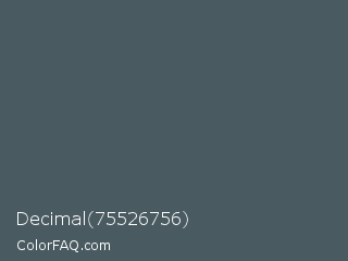 Decimal 75526756 Color is a normal blue color and the nearest color is Trout #4a4e5a. Hex code #495a60 and RGB value is rgb(73,90,96). In RGB color space, this color is composed of 29% red, 35% green, 38% blue, In CMYK color space, this color is composed of 24% cyan, 6% magenta, 0% yellow , 62% black , In HSL color space, this color has a hue angle of 196° , 14% saturation and 33% lightness.