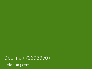 Decimal 75593350 Color is a dark green color and the nearest color is Vida Loca #549019. Hex code #498316 and RGB value is rgb(73,131,22). In RGB color space, this color is composed of 29% red, 51% green, 9% blue, In CMYK color space, this color is composed of 44% cyan, 0% magenta, 83% yellow , 49% black , In HSL color space, this color has a hue angle of 92° , 71% saturation and 30% lightness.