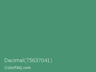 Decimal 75637041 Color is a normal green color and the nearest color is Wintergreen Dream #56887d. Hex code #499473 and RGB value is rgb(73,148,115). In RGB color space, this color is composed of 29% red, 58% green, 45% blue, In CMYK color space, this color is composed of 51% cyan, 0% magenta, 22% yellow , 42% black , In HSL color space, this color has a hue angle of 154° , 34% saturation and 43% lightness.