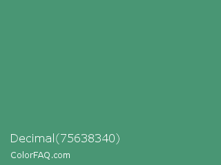 Decimal 75638340 Color is a normal green color and the nearest color is Wintergreen Dream #56887d. Hex code #499674 and RGB value is rgb(73,150,116). In RGB color space, this color is composed of 29% red, 59% green, 45% blue, In CMYK color space, this color is composed of 51% cyan, 0% magenta, 23% yellow , 41% black , In HSL color space, this color has a hue angle of 154° , 35% saturation and 44% lightness.