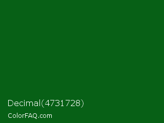 Decimal 4731728 Color is a very dark green color and the nearest color is Camarone #00581a. Hex code #076016 and RGB value is rgb(7,96,22). In RGB color space, this color is composed of 3% red, 38% green, 9% blue, In CMYK color space, this color is composed of 93% cyan, 0% magenta, 77% yellow , 62% black , In HSL color space, this color has a hue angle of 130° , 86% saturation and 20% lightness.