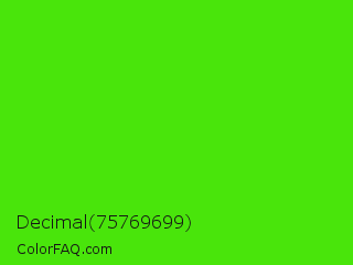 Decimal 75769699 Color is a normal green color and the nearest color is Chlorophyll Green #4aff00. Hex code #49e50b and RGB value is rgb(73,229,11). In RGB color space, this color is composed of 29% red, 90% green, 4% blue, In CMYK color space, this color is composed of 68% cyan, 0% magenta, 95% yellow , 10% black , In HSL color space, this color has a hue angle of 103° , 91% saturation and 47% lightness.