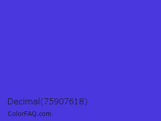 Decimal 75907618 Color is a normal indigo color and the nearest color is Iris #5a4fcf. Hex code #4a38de and RGB value is rgb(74,56,222). In RGB color space, this color is composed of 29% red, 22% green, 87% blue, In CMYK color space, this color is composed of 67% cyan, 75% magenta, 0% yellow , 13% black , In HSL color space, this color has a hue angle of 247° , 72% saturation and 55% lightness.