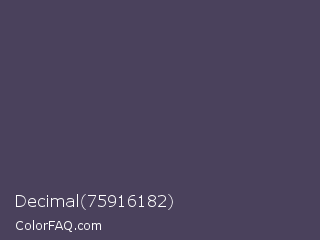 Decimal 75916182 Color is a normal indigo color and the nearest color is Mulled Wine #4e4562. Hex code #4a415c and RGB value is rgb(74,65,92). In RGB color space, this color is composed of 29% red, 25% green, 36% blue, In CMYK color space, this color is composed of 20% cyan, 29% magenta, 0% yellow , 64% black , In HSL color space, this color has a hue angle of 260° , 17% saturation and 31% lightness.