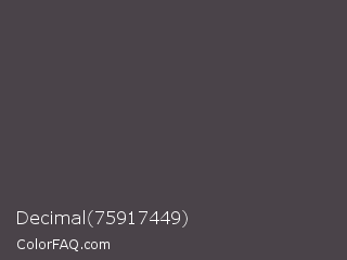 Decimal 75917449 Color is a dark magenta color and the nearest color is Gravel #4a444b. Hex code #4a4349 and RGB value is rgb(74,67,73). In RGB color space, this color is composed of 29% red, 26% green, 29% blue, In CMYK color space, this color is composed of 0% cyan, 9% magenta, 1% yellow , 71% black , In HSL color space, this color has a hue angle of 309° , 5% saturation and 28% lightness.